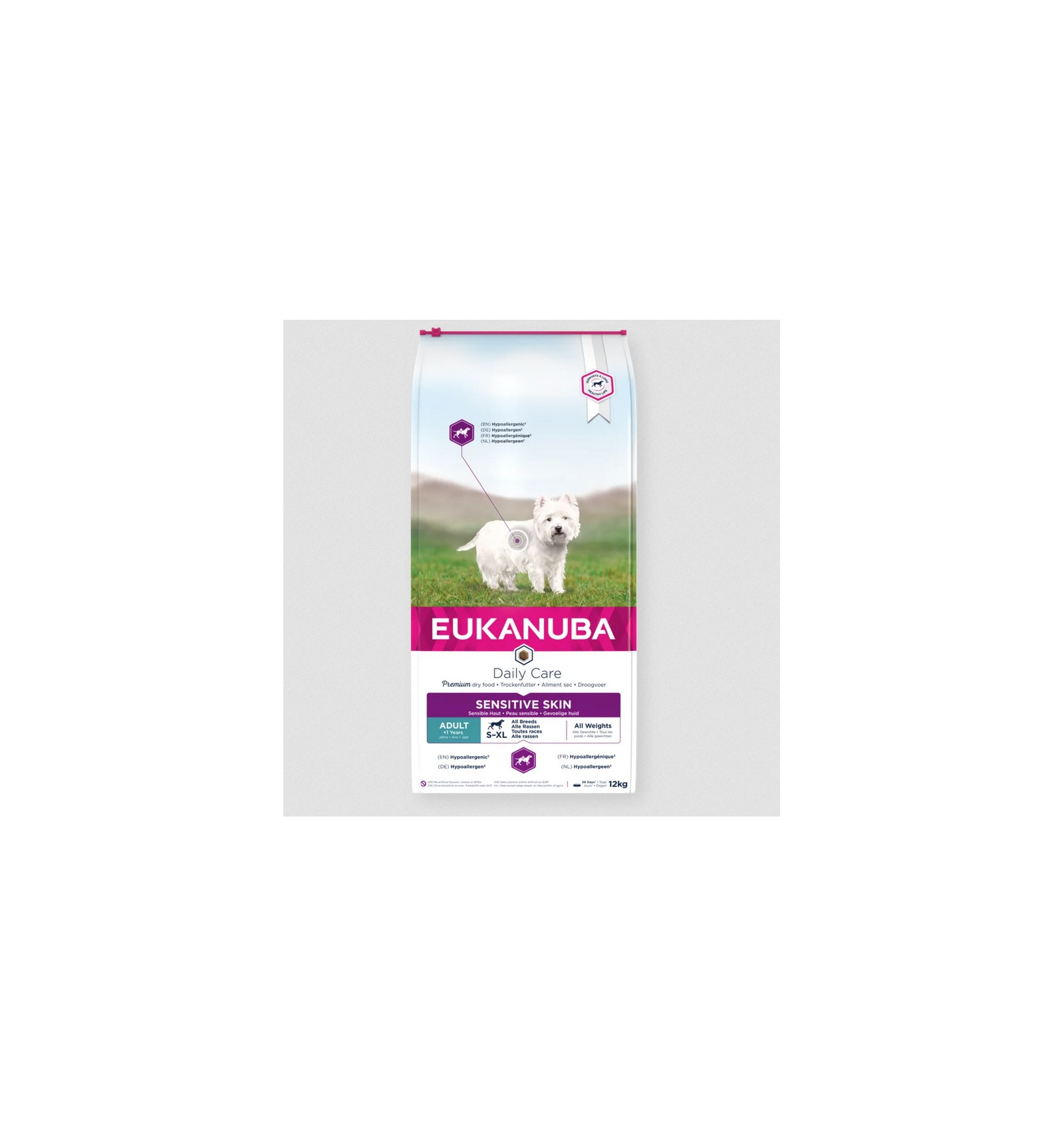 Eukanuba Daily Care Dry Dog Food for Sensitive Skin; formulado para limitar ingredientes que podem causar coceira e arranhões.