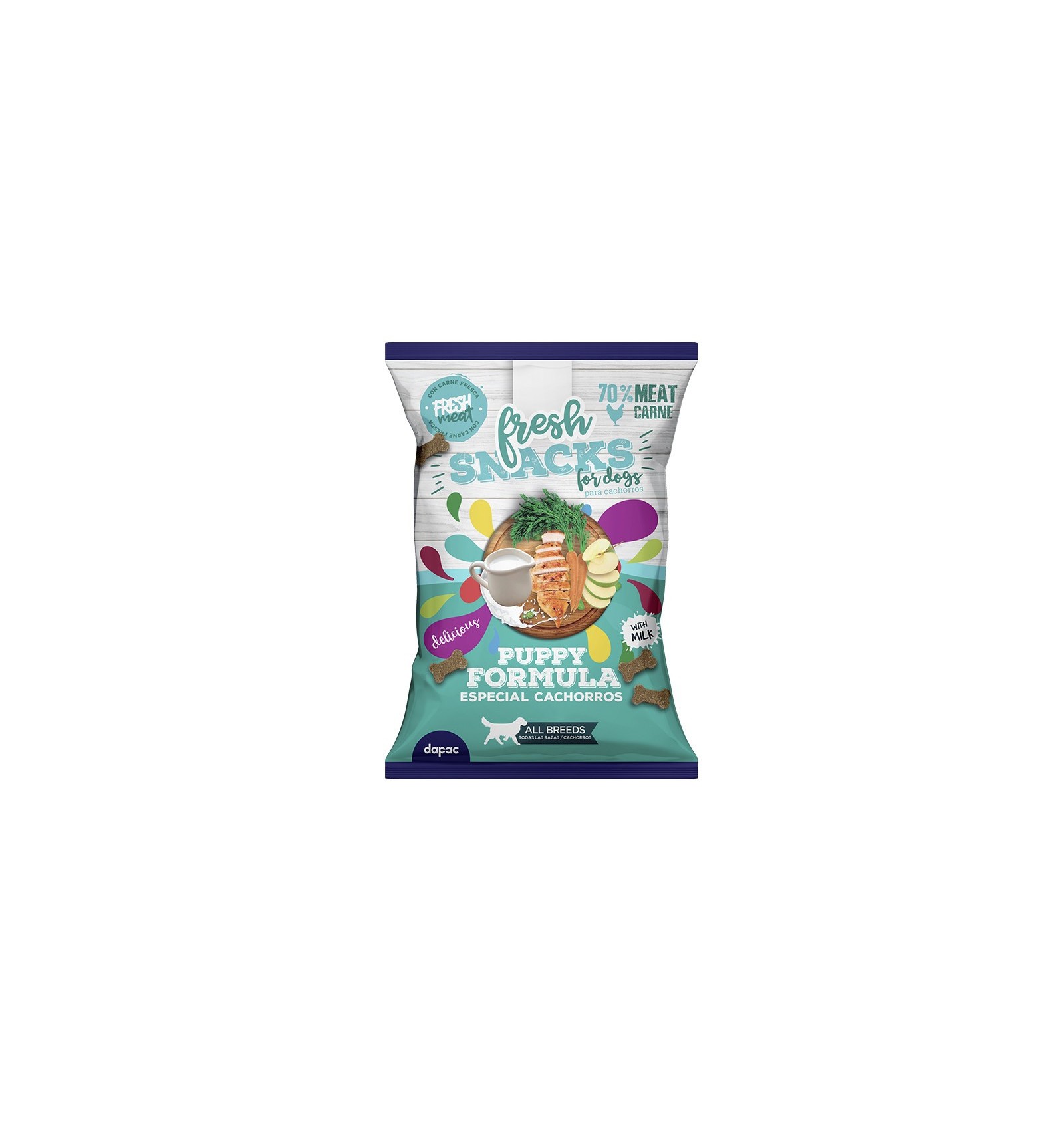 Petiscos Fresh Puppy Formula. Feitos com frango, substituto do leite, frutas e vegetais. Altamente digestíveis. Cozidos lentamente para preservar o sabor e os nutrientes de cada ingrediente. Formato de mini ossinho. Pacote de 70g.