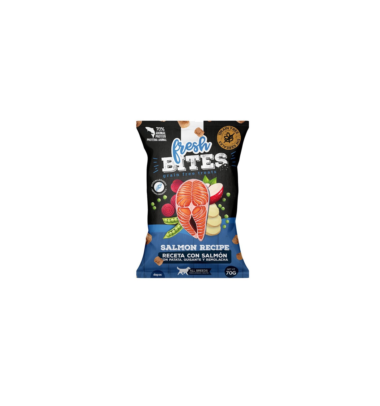Petiscos para cães sem grãos, sabor salmão, ervilha e beterraba. 70% de proteína animal. Altamente digestíveis. Proteína de alta qualidade. Cozidos lentamente. A embalagem contém 70g.