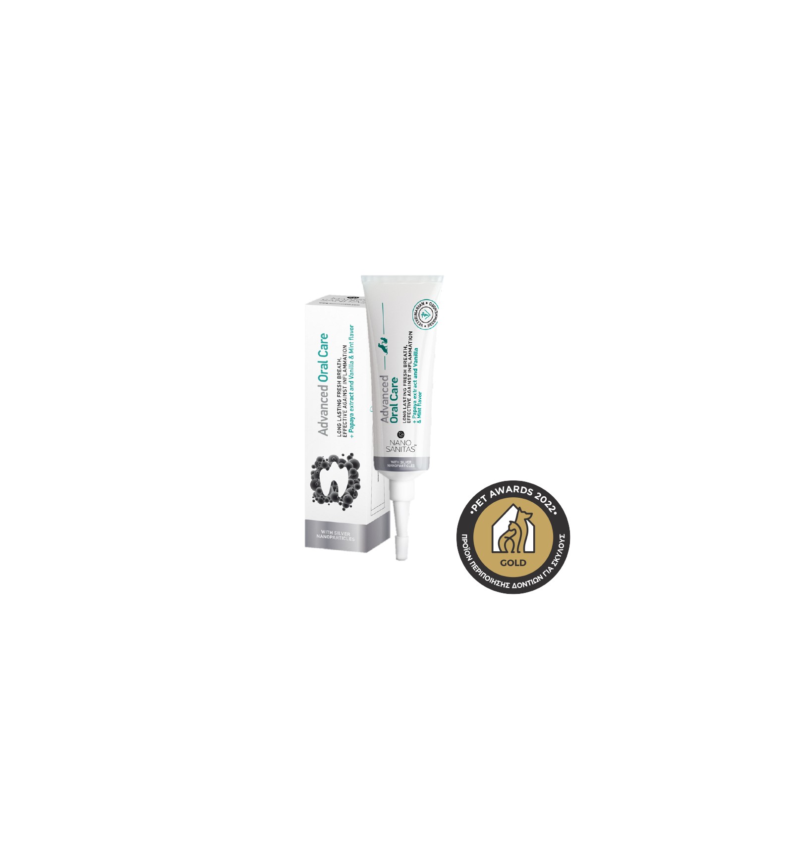 O gel Advanced Oral Care refresca o hálito de qualquer animal de estimação e mantém seus dentes e gengivas saudáveis. Este gel é uma combinação exclusiva de nanopartículas meticulosamente desenvolvidas e ingredientes naturais da mais alta pureza. Sua fórmula mucoadesiva (que adere à gengiva) garante que os ingredientes ativos (nanopartículas de prata e extrato de mamão) permaneçam em contato com os dentes e gengivas do animal por um longo período. O gel Advanced Oral Care protege contra inflamações bucais e retarda o acúmulo de placa bacteriana e tártaro. Isso proporciona alívio e ação duradouros no tratamento de lesões inflamatórias da cavidade oral. Mantém dentes e gengivas saudáveis, reduzindo os custos veterinários com cuidados bucais em até 60%. Contém prata e extrato de semente de mamão que atuam contra bactérias, reduzem o acúmulo de placa em 50% e a inflamação gengival em 40%. Formulado em gel palatável para facilitar a aplicação e a aceitação. Não requer escovação.