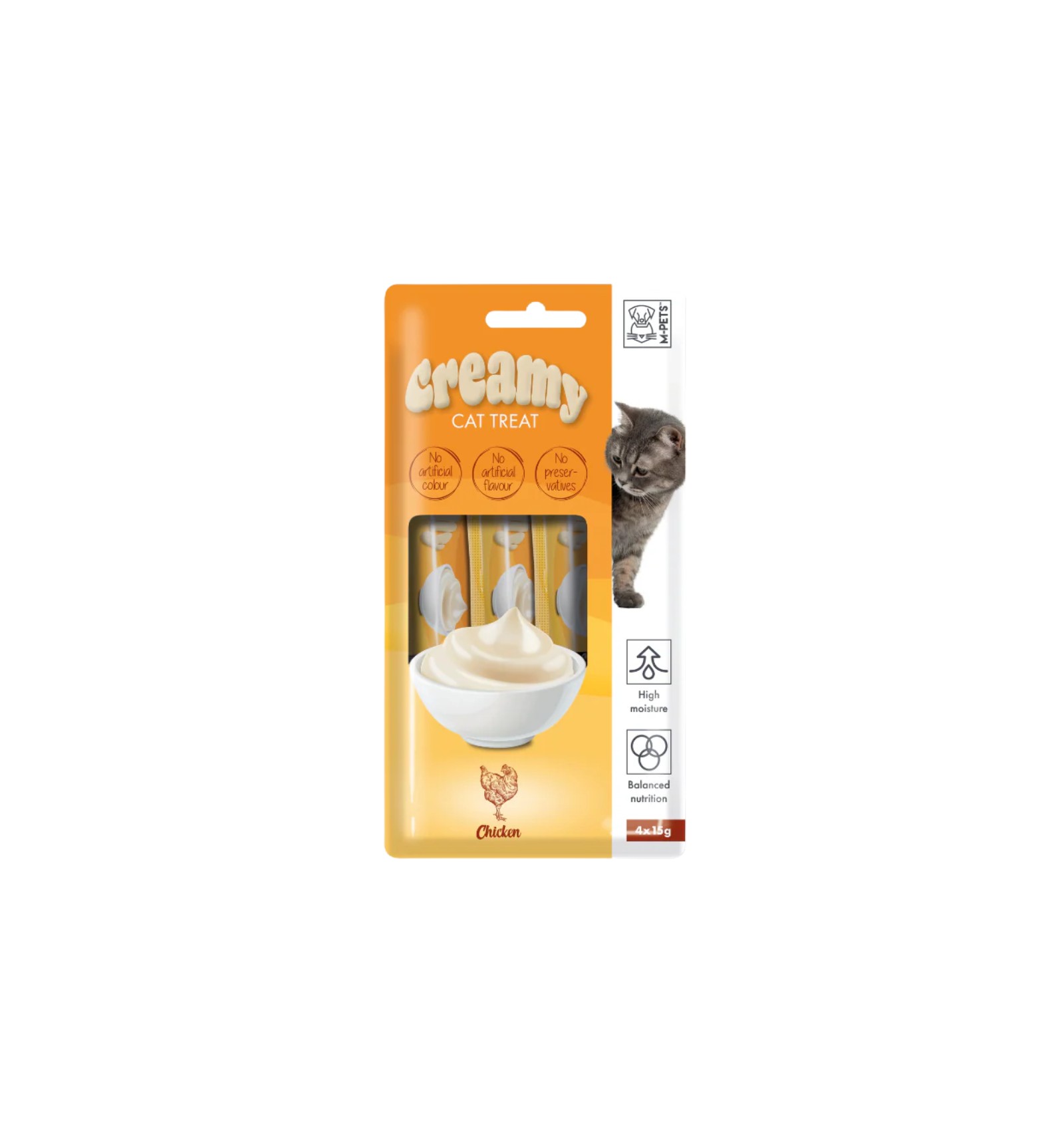 As guloseimas cremosas para gatos M-PETS são o prazer supremo para o seu companheiro felino. Elaboradas com ingredientes frescos e naturais e disponíveis em 4 sabores irresistíveis, estas guloseimas cremosas estão repletas de nutrientes essenciais e transbordam de sabor. Sem aditivos artificiais, uma vez que estas deliciosas guloseimas não contêm aromas, corantes nem conservantes artificiais, garantindo uma experiência saudável e deliciosa para o seu amigo peludo.